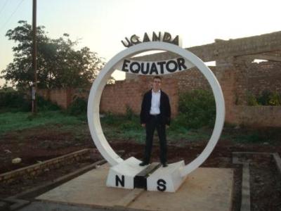 Das bin ich, als wir auf dem Weg nach Masaka zu einer Jubilaumsfeier, denm Aequator ueberquert haben.